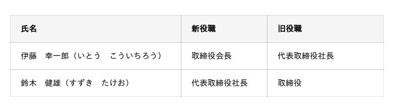 伊藤幸一郎が取締役会長に、前取締役の鈴木健雄が代表取締役社長に就任したことをお知らせします。