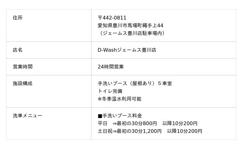 時間を9:00~17:00に短縮いたします。ご利用の際は事前にD-Washジェームス豊川店のホーム