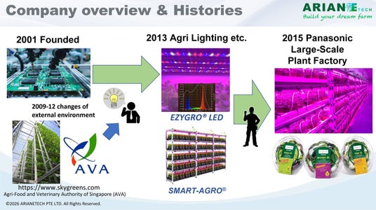 親会社のArianetech Pte. Ltd. はシンガポールで2001年に設立された電子機器メーカー、2013年より戦略の重点を農業テクノロジーへと移行し、これまで培ってきた高度な技術力を活かして都市型食料生産の在り方を革新してきました。2015年にパナソニックからシンガポール初の養液培地耕式人工光型植物工場を受注し設備導入を行い、アグリテック分野における確固たる立ち位置を築く大きな契機となりました。