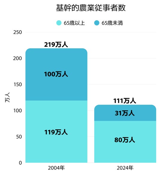 日本の社会課題の一つとして、日本の農業人口の減少やそれに伴うカロリーベース食料自給率の低下があります。基幹的農業従事者(※)の人口は2004年の219万人に対し、2024年には111万人とほぼ半減しています。また、111万人のうちの7割以上が65歳以上とであり、農業での高齢化が急速に進んでいます。(※15歳以上の世帯員のうち、ふだん仕事として主に自営農業に従事している者)