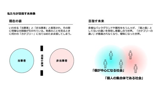 しかし私たちが目指すのは、そうしたカテゴリーによる分断を乗り越え、一人ひとりの背景や経験を尊重しながら、「個」として関わり合う社会です。明確な境界線で分けられるのではなく、個と個がグラデーションのように関わり合う社会。その中では、さまざまな課題が特定の誰かのものではなく、社会を構成する私たち一人ひとりに関わるものとして捉えられていきます。