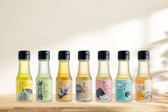 料理の味はそのままに、仕上がりを整えるための調味料です。フレーバーオイルシリーズは、調理の最後に使用する「仕上げ用オイル」として開発されました。ゆず、わさび、しょうが、ポルチーニ茸、黒トリュフ、トリュフ&バター風味、燻製の7種類を展開。それぞれ異なる香りや風味の特性により、料理に余韻を加えます。