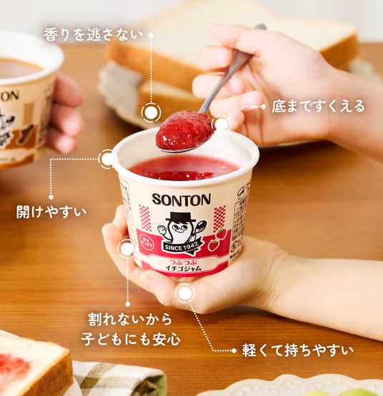 1960年に発売を開始した紙カップジャム・クリームの「ファミリーカップ」は、2025年10月に発売65周年を迎えました。これからも、こだわりを守りながら進化し続け、ソントンらしさで、朝の笑顔に寄り添います。