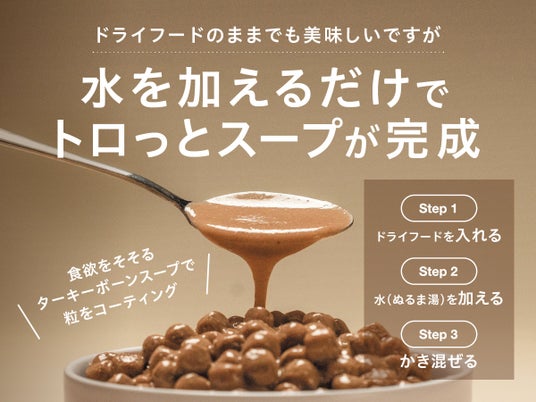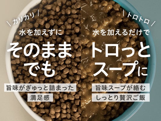 ふやかす際は、ドライフードが浸かるくらいのぬるま湯を注ぎ。30秒間よく混ぜます。その後、お好みでさらに2分間置くことで、より濃厚なグレービースープをお楽しみいただけます。