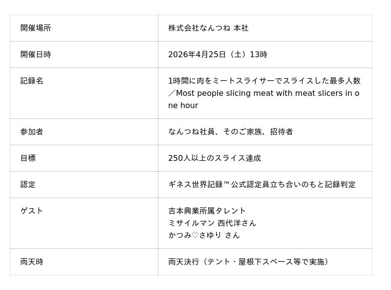 食肉機械の総合メーカーである株式会社なんつね(本社:大阪府藤井寺市、代表取締役社長:南常之)は、2026年4月25日(土)、社員とその家族、大人と子どもがひとつに、ミートスライサーを使用したギネス世界記録(TM)への挑戦を実施します。