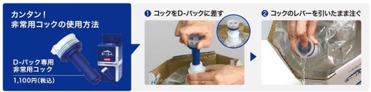 停電時などでサーバーが使用できなくなった場合でも、非常用コック(別売)を使用すれば注水が可能です。また、密閉構造のボトルパックのため、賞味期限が2年間と長く、非常用の備蓄水としてもおすすめです。