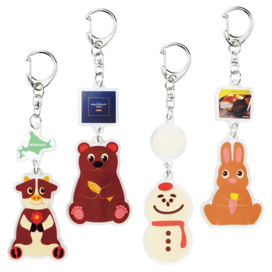 「ロイズポップチョコ」とロイズの人気商品のパッケージや北海道をデザインしたアクリルパーツが2つ連なったキーホルダー。「ロイズ雪だるまチョコ」モチーフのアクリルキーホルダーもございます。