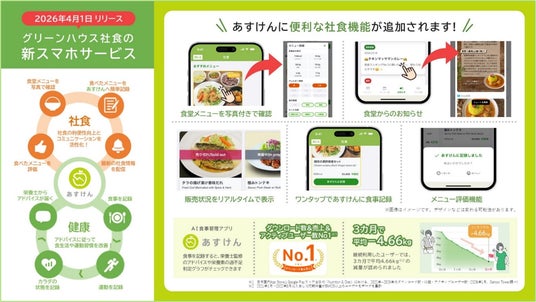 株式会社グリーンハウス(東京都新宿区 代表取締役社長:田沼千秋 以下、グリーンハウス)は、グループ会社である株式会社asken(グリーンハウスグループ100%出資)が開発・運営するAI食事管理アプリ『あすけん』と連携した新サービス「あすけんBizプラン」の提供を4月1日から開始いたします。