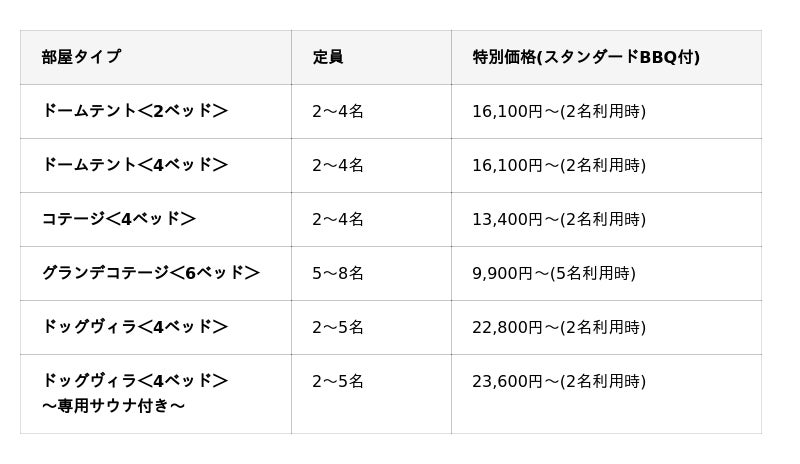 コテージ、ドッグヴィラ、ドームテントと多彩な滞在スタイルをご用意。全室冷暖房完備で、小さなお子様連れや初心者でも安心です。さらに冷蔵庫内のドリンク(アルコール・ソフトドリンク)はすべて無料でご提供。