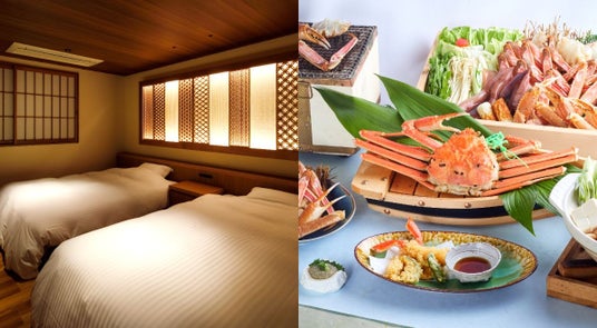 仲買人の主人が長年の目利きで競り落とす、鮮度抜群な魚介が自慢の温泉宿。冬の「松葉がに」をはじめ、春秋にはブランド蟹の「香住ガニ」(ベニズワイガニ)や高級魚「ノドグロ」、夏はケンサキイカやスルメイカの「活イカ」が名物です。