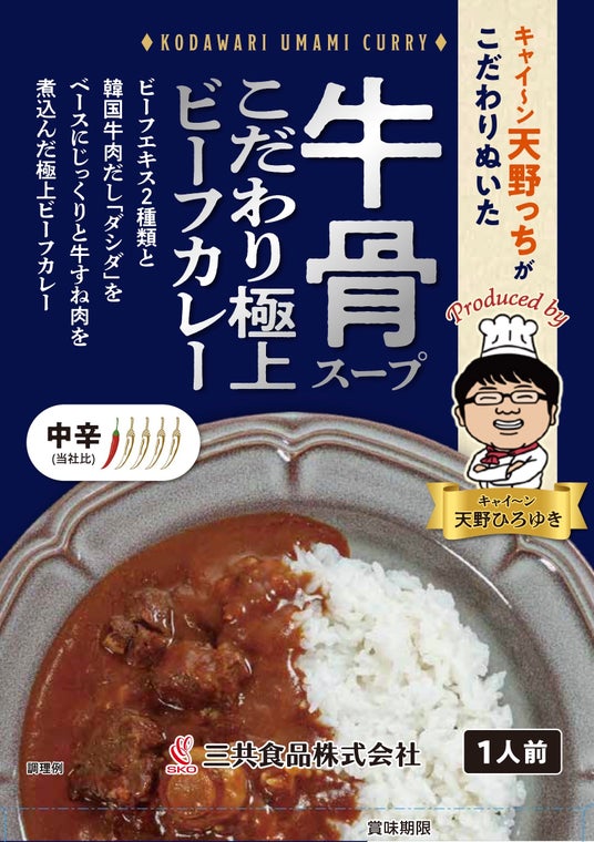 本品は、料理上手として知られる天野のこだわりが存分に詰まったレトルトカレー。「牛骨スープ こだわり極上のビーフカレー」は、韓国牛肉だし「ダシダ」がルーのベースとなっており、しっかりと煮込まれた牛すね肉との相性が抜群。「鶏白湯スープ こだわり旨辛チキンカレー」は、食べ応えのある鶏むね肉に加え、ウズラの玉子が入っているところがポイント。マイルドな鶏白湯スープがベースながらも、しっかりとスパイスが香る逸品。ゴロゴロの角切りポークが入った「豚骨スープ スパイシーポークカレー」は、豚骨スープのまろやかさとジンジャーやブラックペッパーのキレ味が調和。いずれも大人から子どもまで楽しめるカレーとなっています。