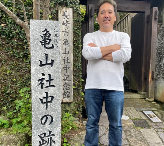 長崎の亀山社中跡地を訪ねて創業の志を再確認する代表の牧内