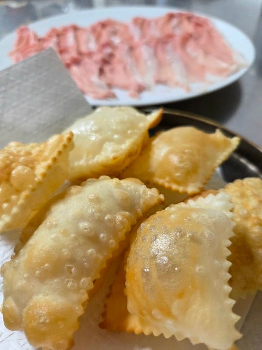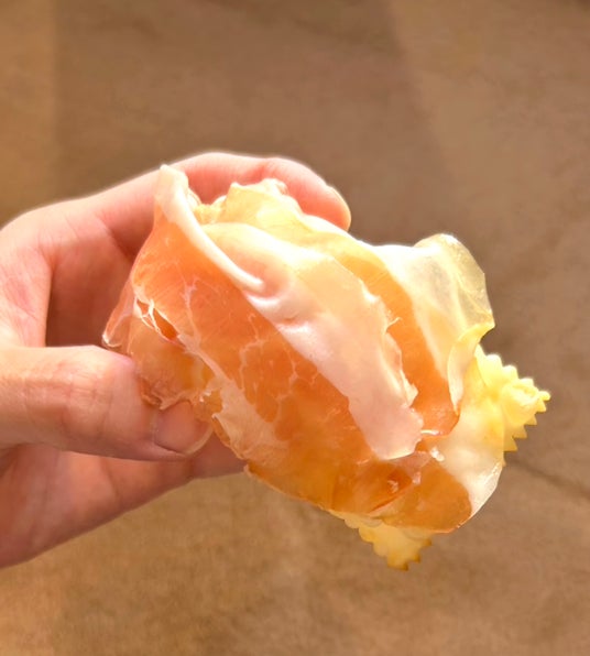 中が空洞の薄い揚げパン、ニョッコの上に生ハムをのせて食べるのが現地のスタイル