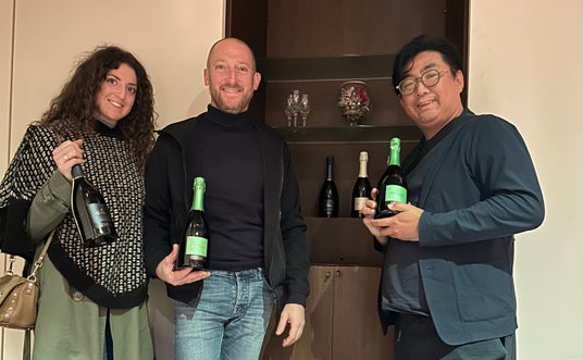 プロセッコの生産者 LeContesse オーナーがENJI神戸本社訪問時の様子 右:ENJIJAPAN安居亮治