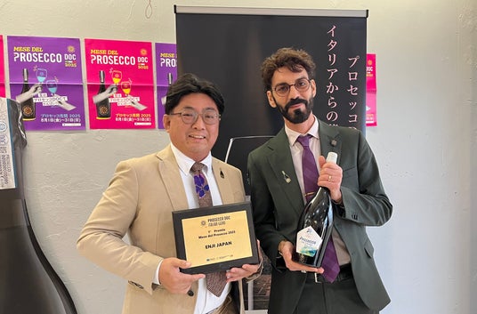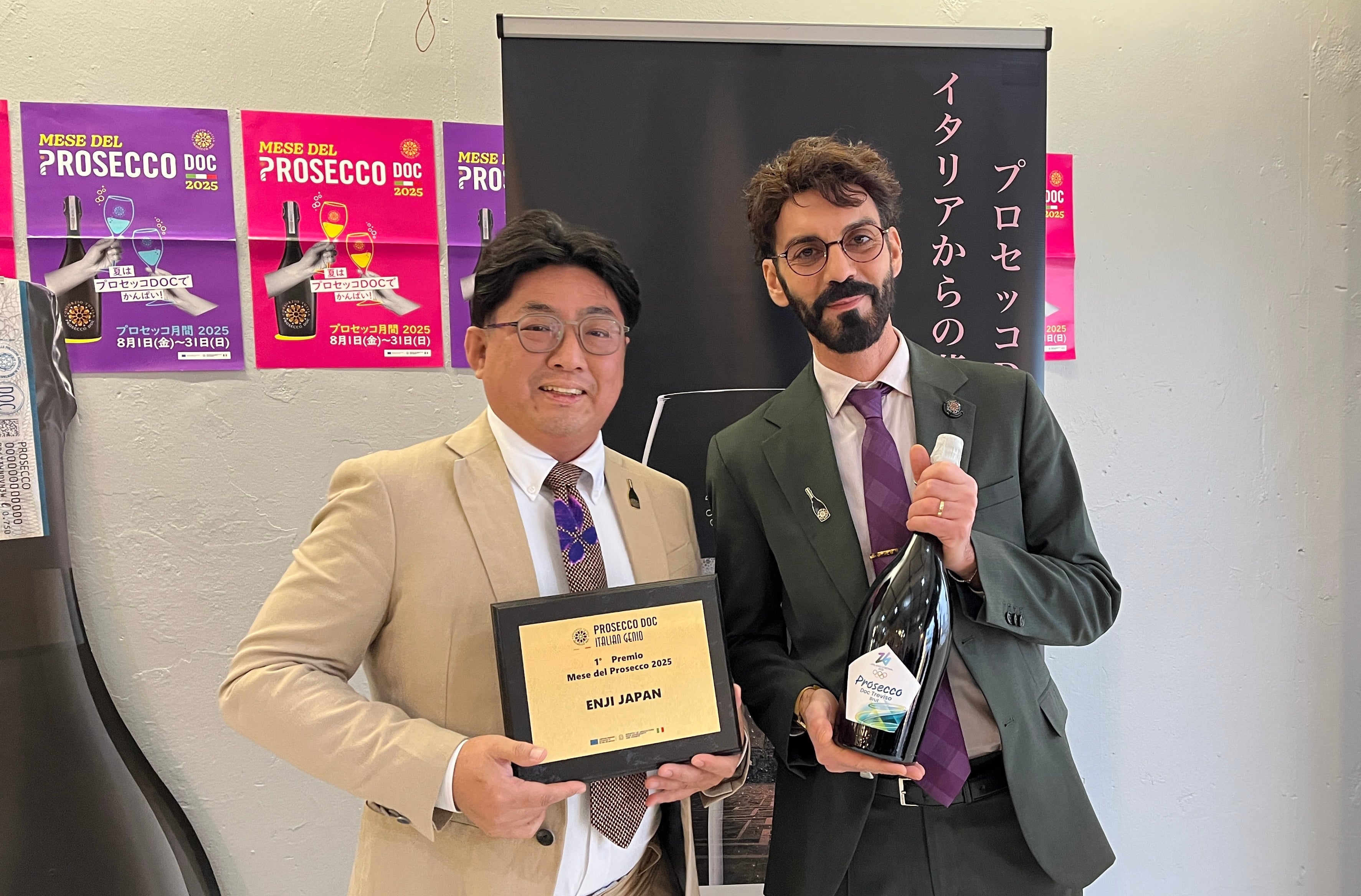 2025年プロセッココンクール総合優勝時の表彰式の様子 左:ENJIJAPAN安居亮治 右:イタリア大使館職員