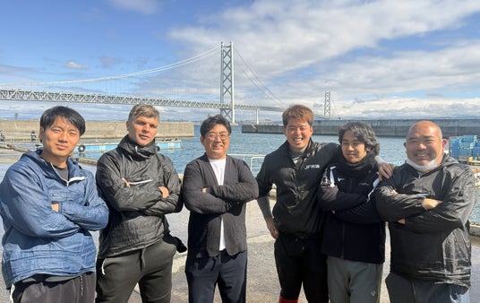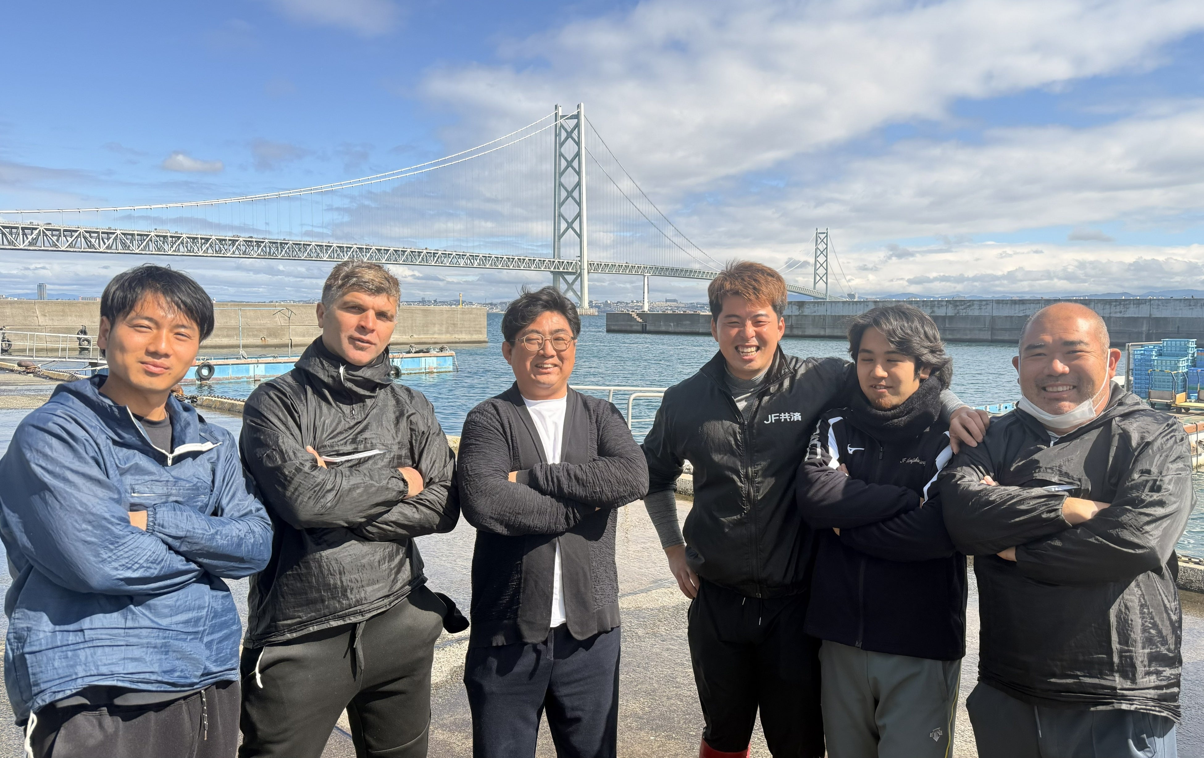 岩屋漁業協同組合の若手組合員達と安居亮治(左から3人目)