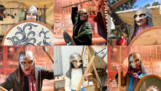 ヴァイキングの装備を実際に身につけられる「盾かぶとの装着体験」は、無料で参加できる人気の企画。これまでのイベントでも、子どもから大人まで幅広く好評でした。