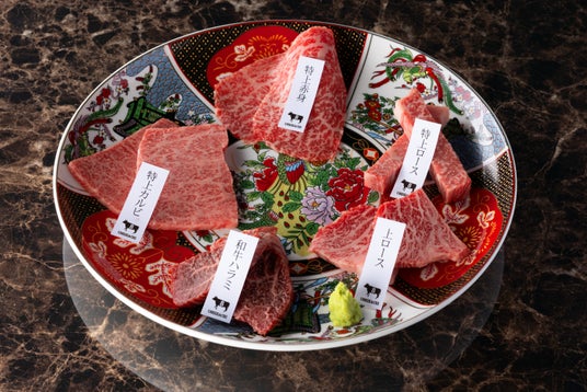きめ細かな霜降りが美しい厳選和牛を、その日おすすめの部位で贅沢に盛り合わせた一皿。
