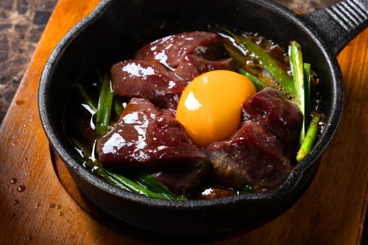 新鮮なレバーをニラとともに卓上で仕上げる、熱々のレバニラ。濃厚な卵黄を絡めれば旨みがさらに引き立ちます。