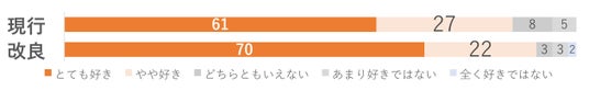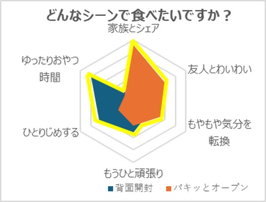 従来の開け方では、細かいゴミが出たり、誰かとシェアすることが難しかったところ、本仕様では箱の中央からパキッと折ることで、軽快にパッケージを開けることができ、手前から左右に分けることで、全く同じ形の2分割ができるようになりました。板チョコを誰かと楽しくシェアする時にも適した開封方法になっています。本仕様について、従来の背面からの開け方と開封時の爽快感(*3)を比較したところ、本仕様は爽快感の項目が有意に高値を示しました。背面には従来の開封口もあるため、これまでの1枚をひとりじめする食べ方も出来ますし、2Wayの開け方によって、様々なシーンに合わせた食べ方もできる新しいパッケージになっています。