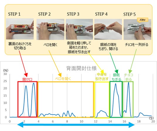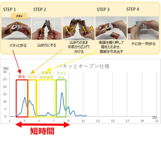 触動作センサーを用いて開封動作を比較したところ、背面開封に比べ、本仕様は省ステップで開封できるため、開封から喫食までの時間短縮につながりました。すぐ食べたい時にもフィットする開け方になっています。触動作センサーによるパッケージ開封時の力