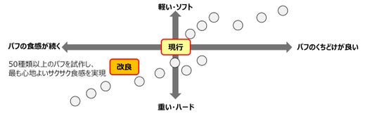 構成要素である「でん粉」の種類を変更したモルトパフを複数種類作成し、食感のマッピングを作りました。マッピングの中で現行よりもサクサク食感が持続する方向に着目し、食感を強化しました。また、でん粉の水分の取り込み方を調整することで、さらにサクサク食感を感じられるように改良を行い、食感の好意度や連食性に関して、現行品を上回るまで調整しました。