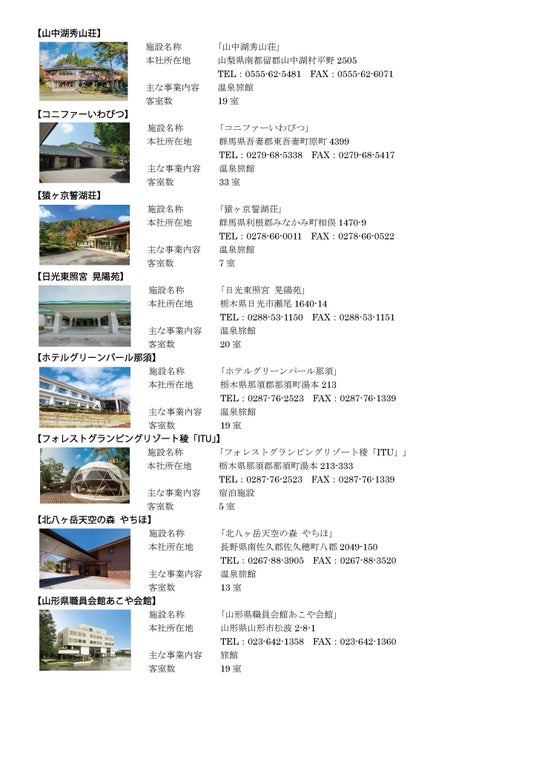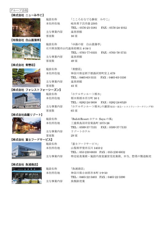株式会社フォレストは宿泊業だけではなく平成22年に旅行業の許可・登録を取得しました。旅行企画と宿泊を一社で一括して行うことで、魅力あふれるツアーをリーズナブルなお値段にてご提供することが可能となり、皆様に大変ご好評をいただいております。また平成25年に学校給食を手掛ける株式会社富士フードサービス、平成26年に魚類卸売業の株式会社魚浦商店、平成27年にホテルサンルート栃木を運営する株式会社フォレストフォーシーズン、平成29年にこころをなでる静寂 みやこを運営する株式会社ニューみやこ、令和4年にゆ湯の宿 白山菖蒲亭を運営する有限会社白山菖蒲亭の株式を取得、令和6年11月にフォレストリゾート初のフォレストグランピングリゾート稜「ITU」(栃木県那須郡那須町)、令和7年12月にBali&Resort Sayaの風(三重県鳥羽市安楽島町)の運営を開始し、食事提供部門と宿泊部門のさらなる強化も進めております。「宿泊」「飲食」「旅行企画」の各事業が伴うことで、観光旅行~ビジネス宿泊~教育旅行等すべてを網羅し、皆様の旅をトータルプロデュースさせていただく所存です。