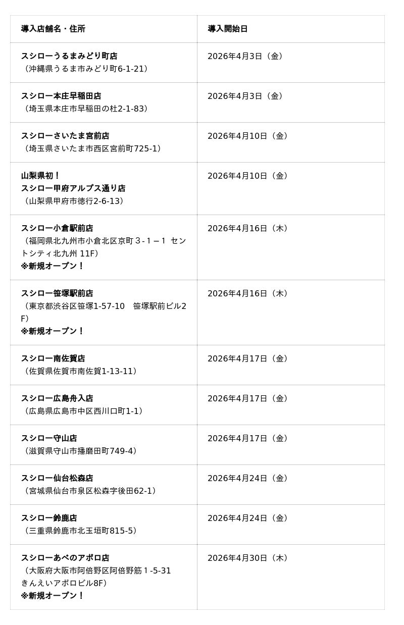 この度、4月10日(金)に山梨県・甲府市で県内初となる「デジロー」導入店が登場いたします。また、16日(木)には福岡県「スシロー小倉駅前店」、東京都「スシロー笹塚駅前店」、30日(木)には大阪府「スシローあべのアポロ店」が新たにオープンします。さらに、宮城県、埼玉県、広島県、滋賀県、三重県、佐賀県、沖縄県内の店舗でもリニューアルオープンに合わせて導入し、4月末時点では全国178店舗にて「デジロー」をお楽しみいただけるようになります。