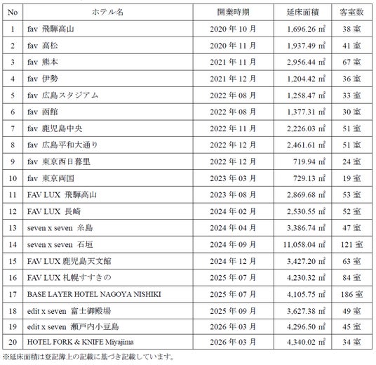 当社は、観光立国の実現や地域創生への貢献を目的にホテルの開発に取り組んでおり、多人数向けホテル『fav』『FAV LUX』『edit x seven』『seven x seven』、およびカルチャービジネスホテル『BASE LAYER HOTEL』をはじめとしたホテルブランドを全国で展開しております。このたび取得した物件につきましては、今後リノベーションをおこなってまいります。