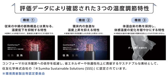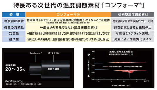 これらの課題に対する答えが、中綿に使用されている住友化学の次世代調温素材「コンフォーマ(R)」です。従来の温度調節素材は、特定の温度で吸熱または放熱のどちらか一方向に働くものが主流でしたが、コンフォーマ(R)は「寝床内の温度変動幅を小さく保つ」という、これまでにない温度緩衝型の特性を持っています。