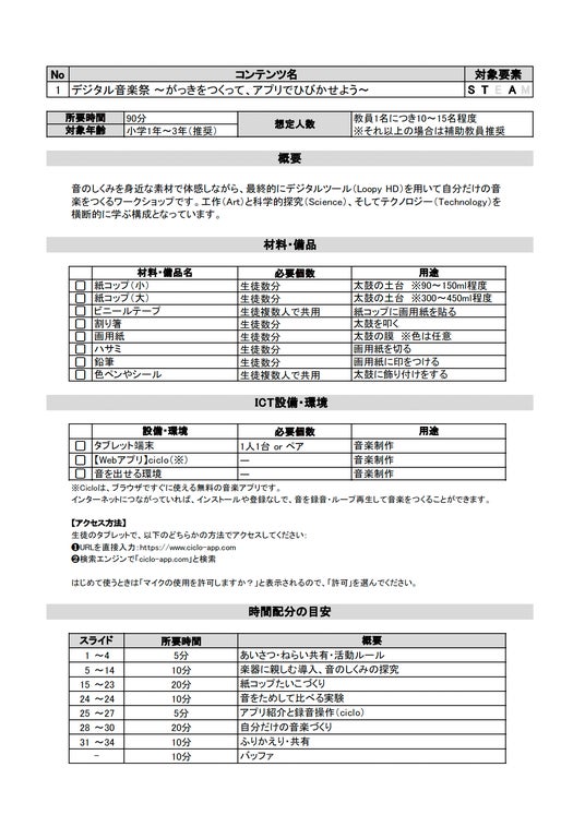 プログラムごとに用意された指導概要(イメージ)。事前準備の負担を大幅に削減し、現場のスタッフがすぐに授業を実施できます。