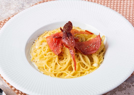 ・チーズの器で仕上げる濃厚チーズパスタ(お客様の目の前でチーズに絡めて仕上げるライブ演出)お客様の目の前でチーズを削りながらパスタを絡め、出来立てならではの香りとコクを楽しめるライブ演出です。