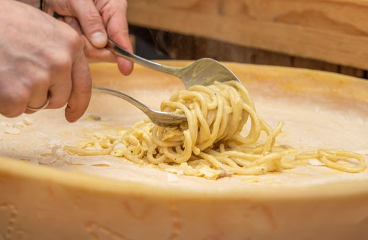 大きなチーズの器でパスタを絡めた後、仕上げにお皿へ美しく盛り付けます。