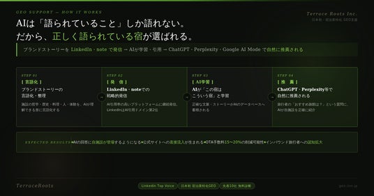 株式会社Terrace Roots(所在地:滋賀県大津市、代表取締役:松井 拓未)は、2026年4月に設立し、ホテル・旅館を対象とした「GEO(Generative Engine Optimization)サポート」サービスの提供を開始いたします。本サービスの核心は、施設のブランドストーリーをLinkedIn・noteなどのメディアで発信し、AIに正しく学習・引用させることで、ChatGPTやPerplexity、Google AI Modeからの「自然な推薦」を実現することです。OTA依存・ゼロクリック・AI不可視という、宿泊業が今まさに直面する3つの構造問題に、正面から切り込みます。