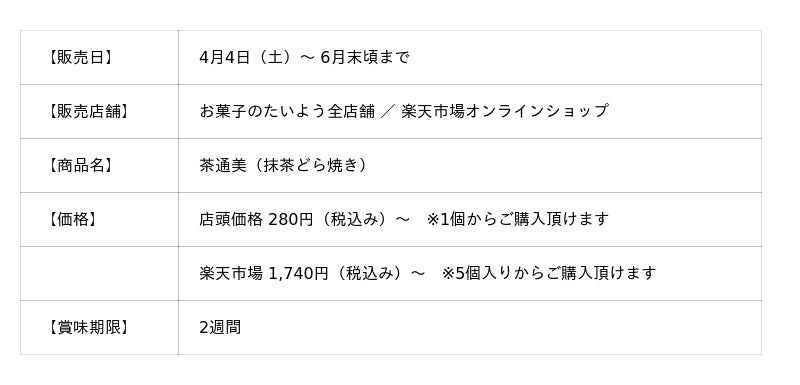 株式会社太陽社(所在地:千葉県匝瑳市飯倉293、代表取締役:片岡正裕)が展開する千葉県で長年愛される菓子店「お菓子のたいよう」は、4月4日の「どら焼きの日」に合わせ、今年最初に摘み取られた一番茶のみの抹茶を贅沢に使用した抹茶バタークリームどら焼き『茶通美(ちゃつみ)』を、4月4日(土)~6月末までの期間限定で販売いたします。