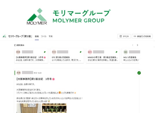 - 「One MOLYMER」としての結束拠点を越えて同じ「命(苗木)」を育む共通体験を通じ、グループビジョンである「一人ひとりの力の結集」を具現化します。