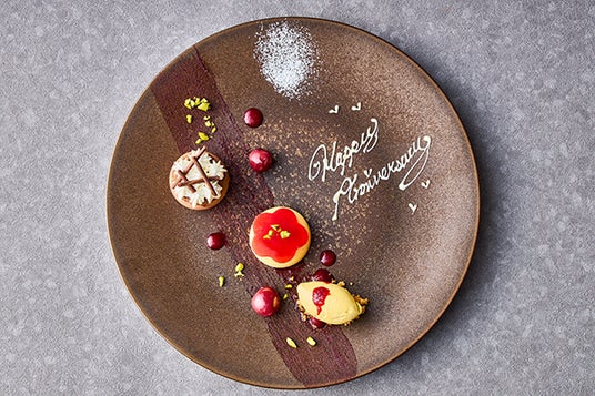 魚介をふんだんに使った花束を思わせる彩り豊かなオードブルをはじめ、香り高いバジルソースにあさりの凝縮した旨みを重ねたジェノベーゼパスタ、香ばしく焼き上げた牛肉の芳醇な旨みをコク深いグレイビーソースと合わせたサーロインのポワレ、そしてココア生地とグリオットチェリー、キルシュ、生クリームを使用したドイツ発祥の伝統菓子「フォレノワール」を小菓子のように一口サイズにして愛らしく盛り付けたデザートまで、全4品をご用意いたします。デザートプレートには大切な想いを乗せたメッセージを添えてご提供いたします。種類豊富なフリーフローを楽しみつつ、高層階から望むきらめく夜景に包まれながら、大切な記念日やお誕生日をお過ごしください。