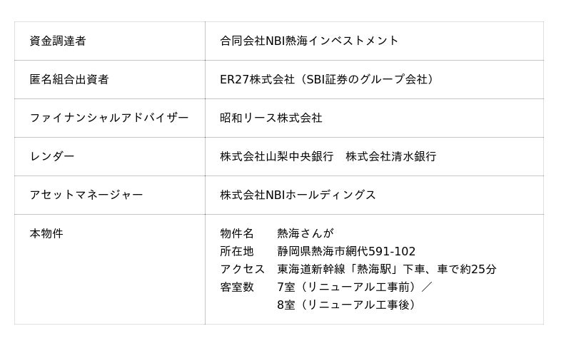 株式会社SBI証券(本社:東京都港区、代表取締役社長:高村 正人、以下「SBI証券」)のグループ会社であるER27株式会社は、株式会社NBIホールディングス(以下「NBIホールディングス」)が組成した、静岡県熱海温泉の高級温泉旅館「熱海さんが」(以下「本物件」)を対象とする旅館のバリューアップと運用を目的としたファンド「合同会社NBI熱海インベストメント」(以下「本件ファンド」)に対し、匿名組合出資を行いましたのでお知らせいたします。
