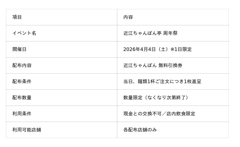 「近江のちゃんぽんをニッポンのちゃんぽんに!」をスローガンに掲げるドリームフーズ株式会社(本社:滋賀県彦根市/代表取締役社長:山本英柱)は、近江ちゃんぽん亭 イオンモール鶴見緑地店(大阪府大阪市)および近江ちゃんぽん亭 五個荘店(滋賀県東近江市)がそれぞれ周年を迎えたことを記念し、2026年4月4日(土)に「周年祭」を開催いたします。