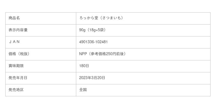 “ばかうけ”“星たべよ”“瀬戸しお”など米菓を製造販売する(株)栗山米菓(代表取締役社長:栗山敏昭 新潟市北区)は、アップサイクル商品『ろっから堂(さつまいも)』を2023年3月20日(月)に全国のスーパーなどで発売いたしました。内容量90g、NPP(税別参考価格250円)。※商品のお取扱開始日は、店舗によって異なる場合がございます。