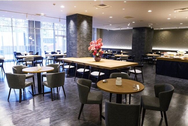 レストラン「DINING TSUZUMI」は高い天井に、延べ288平方メートル の広々とした解放感溢れるスペース。金沢駅の鼓門を眺められるガラス貼りの空間に、天候に恵まれる時期は明るい朝の光が降り注ぎます。