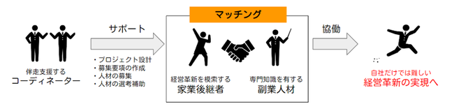 本プログラムは、業種を問わず様々な事業課題を持つ家業後継者に対して、経営戦略の立案やマーケティングやDX化、業務効率化などの専門的かつ多様なテーマに知見を持つ副業人材をマッチングすることで、経営革新の実行支援を行うプログラムです。