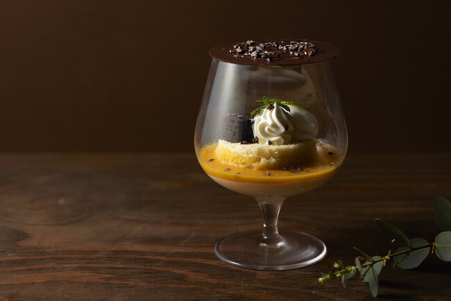 5・6月は、幻想的なデザートタイムを演出する「大人のチョコレートパフェ 瞬間スモーク」をご用意しました。グラスの一番下はホワイトチョコのムースを流し込み、その上にジェノワーズを置いて、周りに初夏を感じさせるパッションフルーツのピューレを使用しました。中央にはガトーショコラとライムシャーベットを乗せ、スモークをチョコレートの蓋で閉じ込めました。温かいブランデー入りのチョコレートソースをゆっくりと蓋にかけて、立ち込めるスモークの香りとチョコレートとの相性をお楽しみください。見て、香って、味わって、五感で堪能いただける一品です。