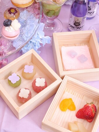 てでぃじんじゃーくんの白玉黒蜜きな粉抹茶ぷりんパフェやマカロンに見立てたブルーベリー最中