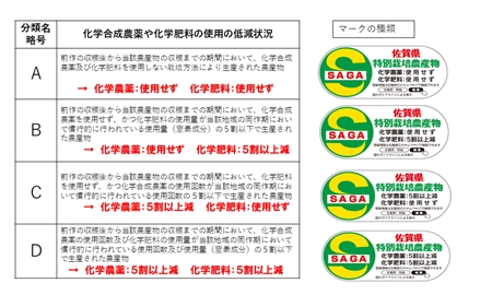 佐賀県特別栽培農産物表示制度最終更新日:2022年1月28日 制度の概要佐賀県特別栽培農産物表示制度とは、化学合成農薬の使用回数と化学肥料の使用量が、県内の一般的な栽培方法(いわゆる慣行栽培)に比べて5割以上減らして栽培されていることを、「確認責任者」がその栽培履歴(栽培日誌)や現地審査等を行うことにより確認し、基準を満たしていると認められた農産物を「佐賀県特別栽培農産物」として表示する制度です。(令和4年2月現在:68品目の食用の農産物が対象) 「消費者の皆様に安全・安心な農産物を届けたい」、「地元農産物への愛着を深めてもらいたい」、「地産地消につながってほしい」など、生産者のこだわりと想いがたっぷり詰まった佐賀県特別栽培農産物を、直売所やスーパーなどでお見かけの際は、ぜひお買い求めください。 特別栽培について詳しくは佐賀県特別栽培農産物表示制度の仕組み 佐賀県特別栽培農産物表示マーク(4種) |