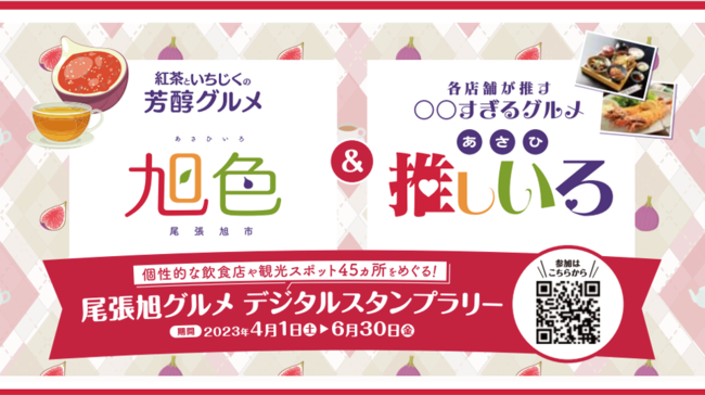 尾張旭市内の「紅茶」や「いちじく」の新商品やメニューが楽しめる「旭色」が30スポット、お店のイチ推しメニューが楽しめる「あさひ推しいろ」が11スポット、その他市内の観光スポットの4スポットが対象となります。