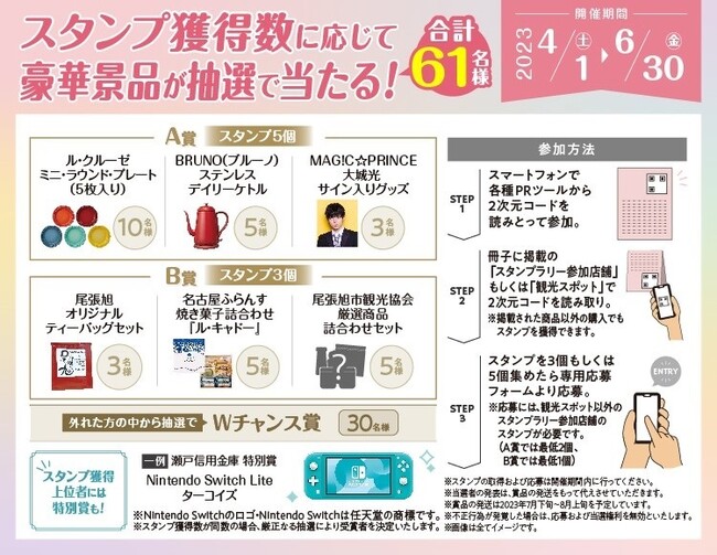 豪華景品には有名ブランドの食器や家電製品、また抽選に外れてしまった方でも当選チャンスがあるWチャンス賞など盛りだくさんです。さらに今回、東海地方で活躍中のボーイズグループ『MAG!C☆PRINCE』のメンバー「大城光」さんに「旭色」プロジェクトに参加いただき、サイングッズも豪華景品として用意しています。さらに瀬戸信用金庫特別賞など期間中に最も多くスタンプを獲得した方にも人気ゲーム機等の豪華プレゼントを用意しています。