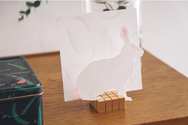 蓋を開けると、黒いうさぎの優しさと純粋さを表した真っ白なうさぎが目に飛び込んできます。こちらは、うさぎの型抜きと背景に分かれた2枚のアートカードとなっており、白箔で表現された上品な仕上りで、しっかりと厚みがあります。ペーパーオブジェとして部屋に飾っておけるほか、オリジナルのメッセージカードとしても使用することができます。
