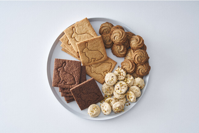 今回モチーフの主役となる黒いうさぎと白いうさぎをイメージした新作クッキー4種をセット。北海道産の小麦粉や全粒粉・バター、沖縄産きび砂糖を使用し、カカオや塩バター、コーヒーやピスタチオなど素材本来のおいしさがシンプルにたのしめる手づくりクッキーです。