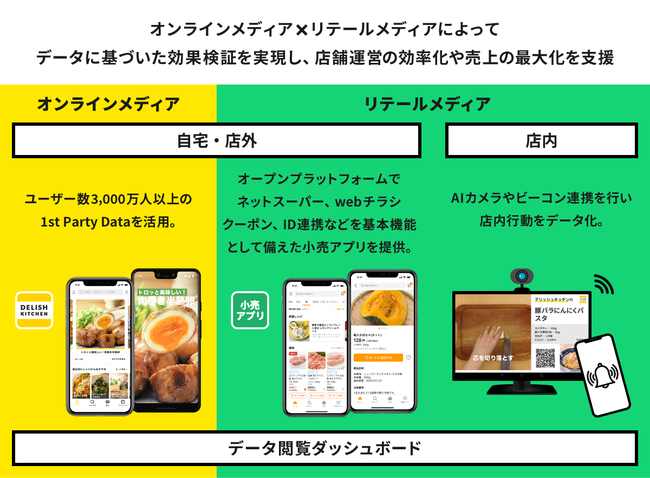 また、2018年より提供を開始した食品スーパー向け店頭サイネージは、現在では2,300店舗以上に導入されており、日本最大級の店頭サイネージ広告プラットフォームに発展しています。さらに近年では、AIカメラやビーコン連携による来店客の店内行動のデータ化や、『DELISH KITCHEN』のアセットを活用したネットスーパーやwebチラシ、クーポン、ID連携等の機能を有する小売アプリを開発するなど、オンライン・オフラインでの様々なDX支援サービスを食品スーパー向けに提供しています。